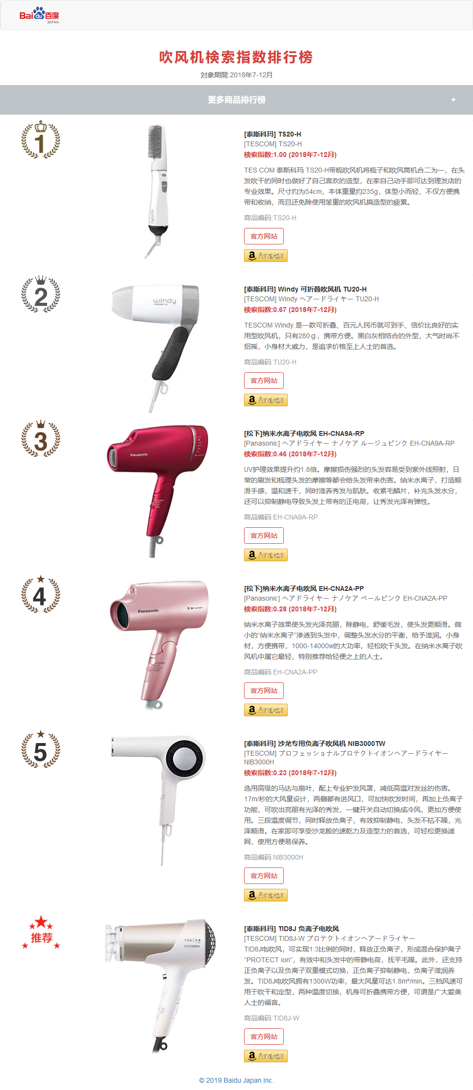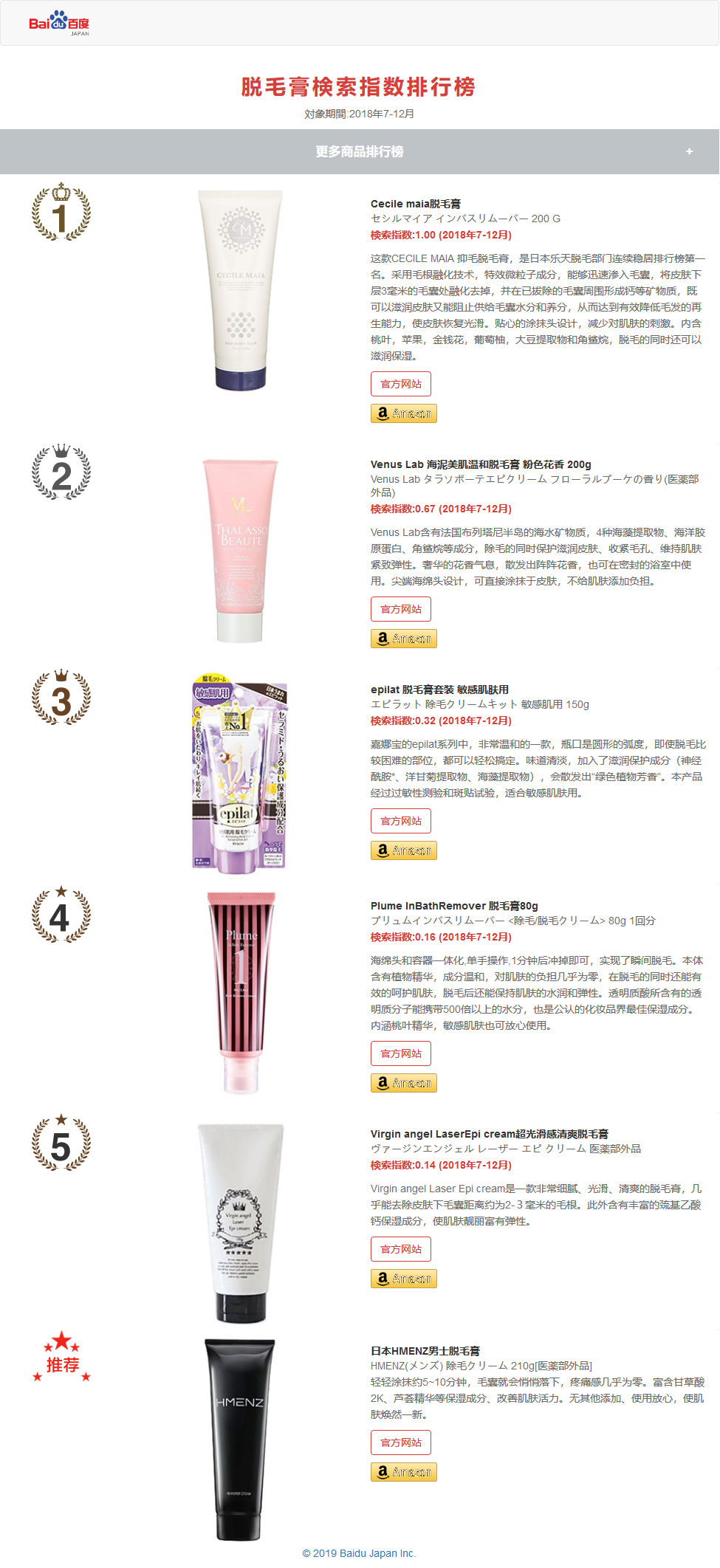 对于赴日旅游的中国游客来说,购物是他们的主要活动之一。2018年中国游客的人均消费额达22万3,640日元(约合人民币1万3,843元*),相对同比总体海外游客的人均消费额为15万2,594日元(约合人民币9,445元),整整高出 7万1,046日元(约合人民币4,398元)。其中仅购物一项,中国游客的平均消费额为11万923日元(约合人民币6,866元),是总体游客平均消费额的2倍以上!大部分中国游客喜欢在出行前预先拟定详细的购物清单,互联网更是获取信息的重要手段。为此,百度日本专门设立了能够分类搜索日本商品关注度的网站,自2015年起,更新百度日本旅游购物的人气排行榜。今年根据游客需求,发表了2018年度下半年(7月-12月份)的百度日本购物排行榜,内容主要来源于百度搜索数量。*汇率以2019年1月24日中国银行折算价1日元=0.0619元计算。