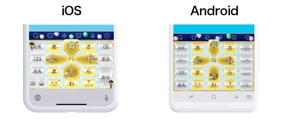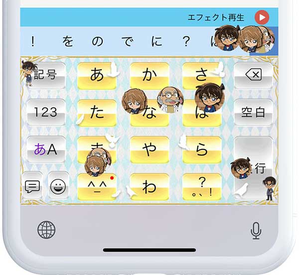 入力エフェクト機能とは、ユーザーが文字を入力し、変換候補より特定のキーワードを選択することで画像がキーボード上に現れる機能です。「コナンパズル」やキャラクター名を入力することでキャラクターの画像がキーボード上に現れます。関連ワードに設定されている隠れエフェクトを探してみてください。