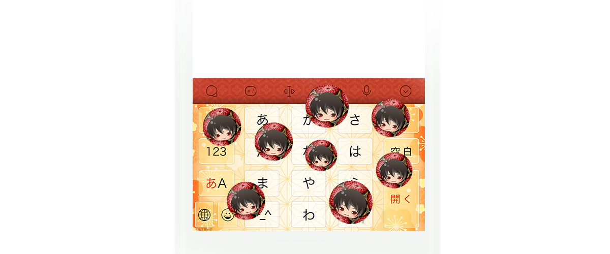 入力エフェクト機能とは、ユーザーが文字を入力し、変換候補より特定のキーワードを選択することで画像がキーボード上に現れる機能です。「織田信長」やほかの武将名を入力することで可愛いイラストがキーボード上に現れます。