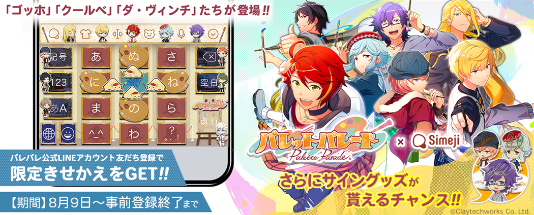 バイドゥ株式会社(本社:東京都港区、代表取締役社長 Charles Zhang)が提供する日本語入力&きせかえ顔文字キーボードアプリ「Simeji」(iOS版、Android版)は、株式会社クレイテックワークス(本社:東京都港区、代表取締役社長 青木 克仁)が提供する事前登録受付中の“芸術家”育成タイムライズゲーム「パレットパレード(パレパレ)」と期間限定でコラボキャンペーンを本日より展開します。
