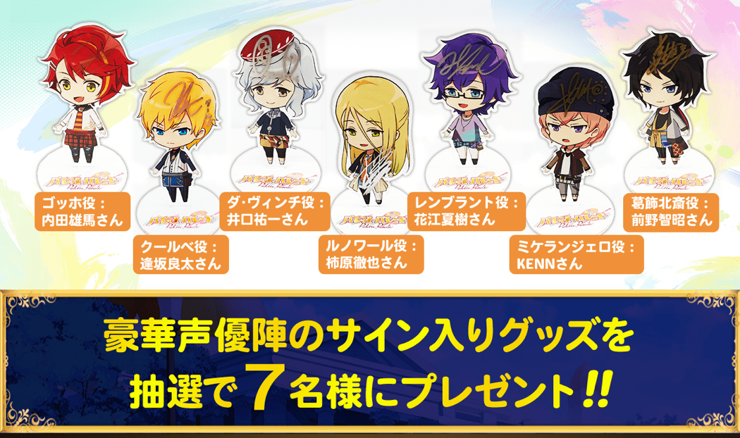 また、上記のきせかえデザイン取得後、コラボきせかえを適用することで画面に表示されるマークをタップすると抽選キーワードをゲットできます。そのキーワードを「パレットパレード」のLINE公式アカウントに送信すると抽選で7名様に出演声優さんのサイン入りアクリルスタンドがもらえるキャンペーンにエントリーができます。ここでしか手に入らないアイテムを手にいれましょう!