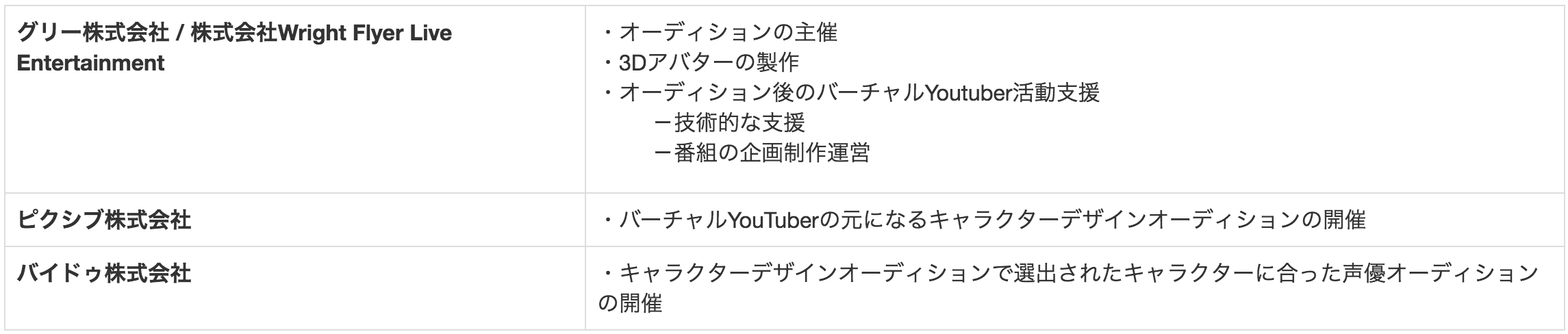 今回のオーディションでは、はじめに画像投稿サイト「pixiv」で5体のキャラクターを選出するためのオーディションを実施し、キャラクター決定後にバーチャルYouTuberの「中の人」の声優を選出するためのオーディションをバイドゥが運営するボイスアプリ「LisPon(リスポン)」で実施します。キャラクターと声優決定後、バーチャルYouTuberとして発信するための企画・運営・配信やマネジメントは、グリーの100%子会社であるWFLEが担当し、今夏にデビューを予定しています。