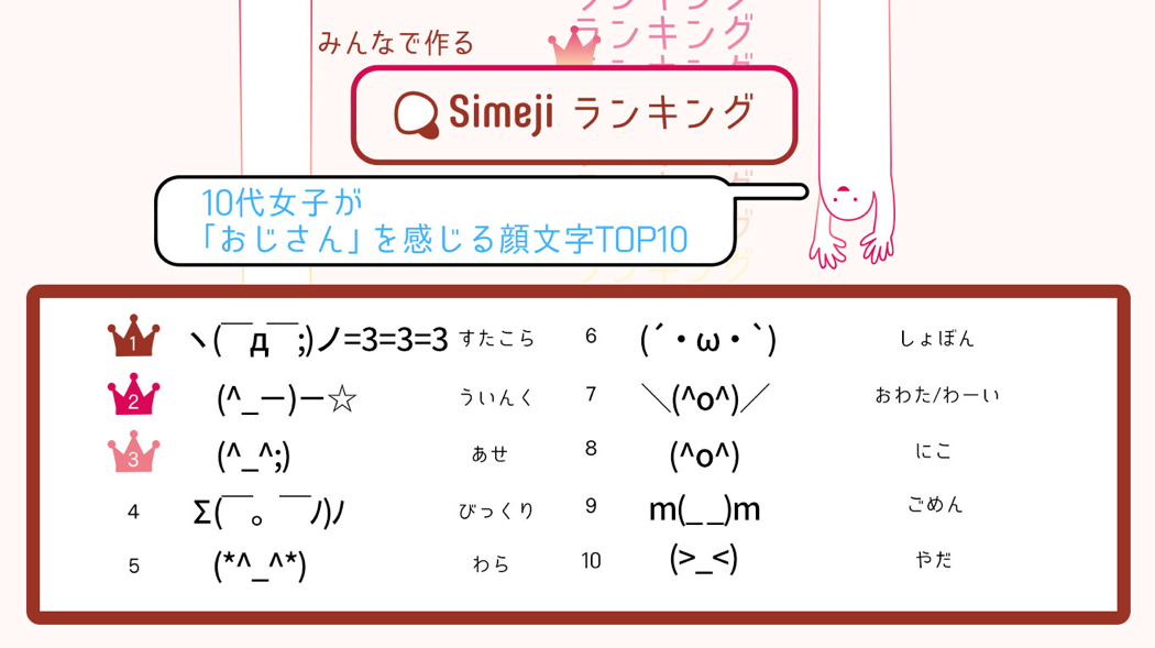 [Simejiランキング]利用注意顔文字!? Simejiランキングが10代女子4,000人に聞いた 「おじさん」を感じる顔文字TOP10!