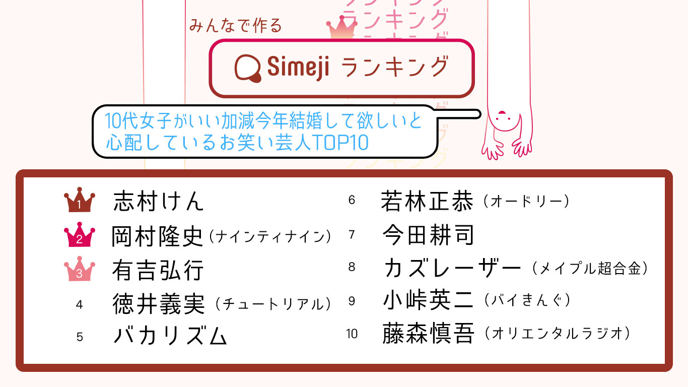 お笑い界のバチェラー認定!? Simejiランキング10代女子3,000人が選んだ 「いい加減今年結婚して欲しいと心配しているお笑い芸人TOP10」
