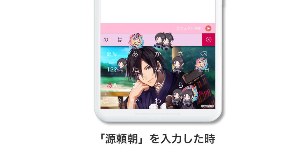入力エフェクト機能とは、ユーザーが文字を入力し、変換候補より特定のキーワードを選択することで画像がキーボード上に現れる機能です。「源頼朝」やほかのキャラクター名を入力することで可愛いイラストがキーボード上に現れます。