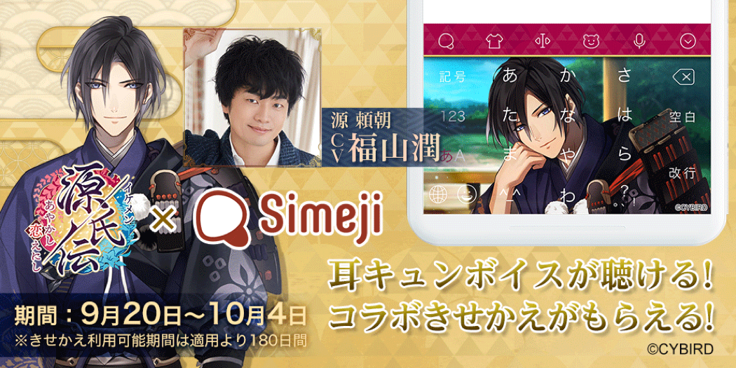 バイドゥ株式会社(本社:東京都港区、代表取締役社長 Charles Zhang)が提供する日本語入力&きせかえ顔文字キーボードアプリ「Simeji」(iOS、Android版)は、株式会社サイバードの新作恋愛ゲーム「イケメン源氏伝 あやかし恋えにし」と、期間限定のコラボキャンペーンを本日より10月4日(木)まで実施します。