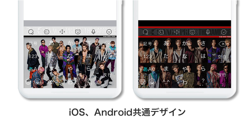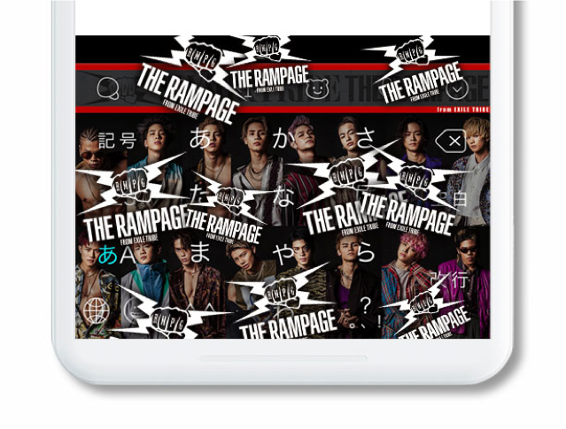 入力エフェクト機能とは、ユーザーが文字を入力し、変換候補より特定のキーワードを選択することで画像がキーボード上に現れる機能です。「THE RAMPAGE from EXILE TRIBE」関連のワードを入力することで楽しむことができます。入力エフェクトは1種類。関連ワードに設定されているエフェクトを探してみてください。