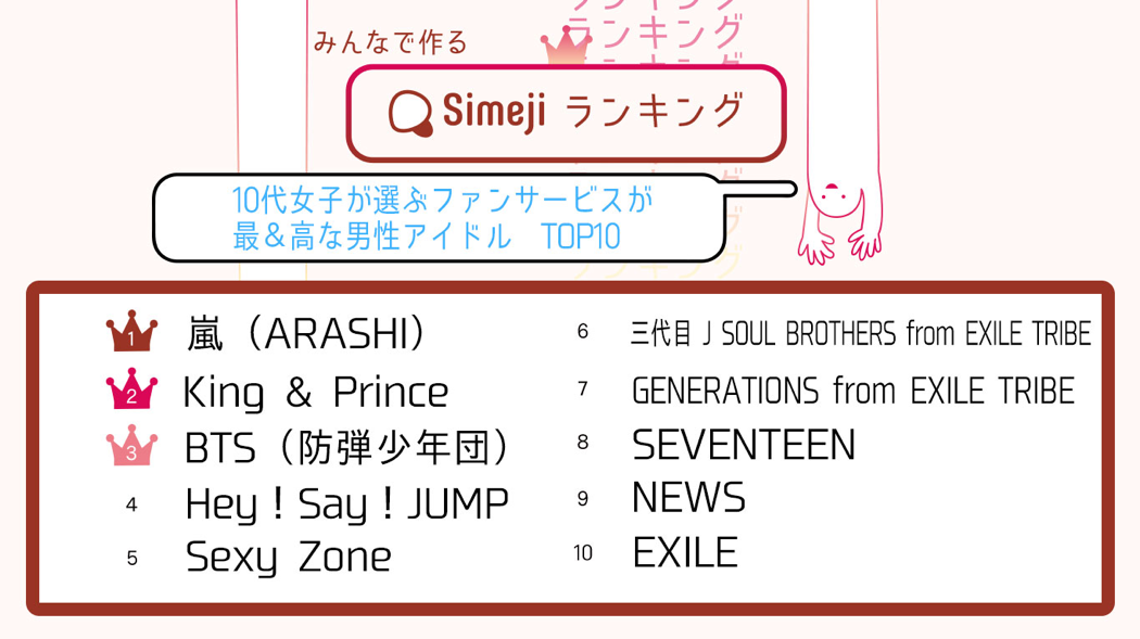 Simejiランキング 究極のアイドルは、ここがすごい!! Simejiランキング10代女子3,000人が選ぶ 「ファンサービスが最&高な男性アイドル TOP10」