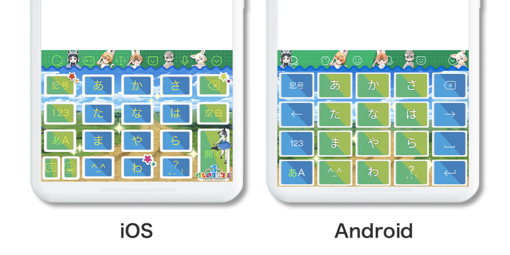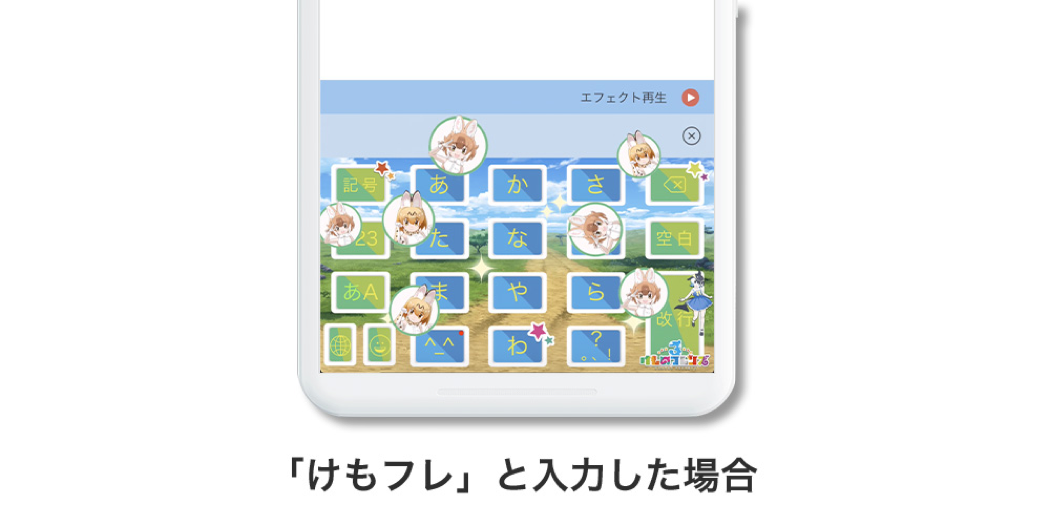 入力エフェクト機能とは、ユーザーが文字を入力し、変換候補より特定のキーワードを選択することで画像がキーボード上に現れる機能です。「けもフレ」を入力することで可愛いイラストがキーボード上に現れます。是非色んなワードを探してください。