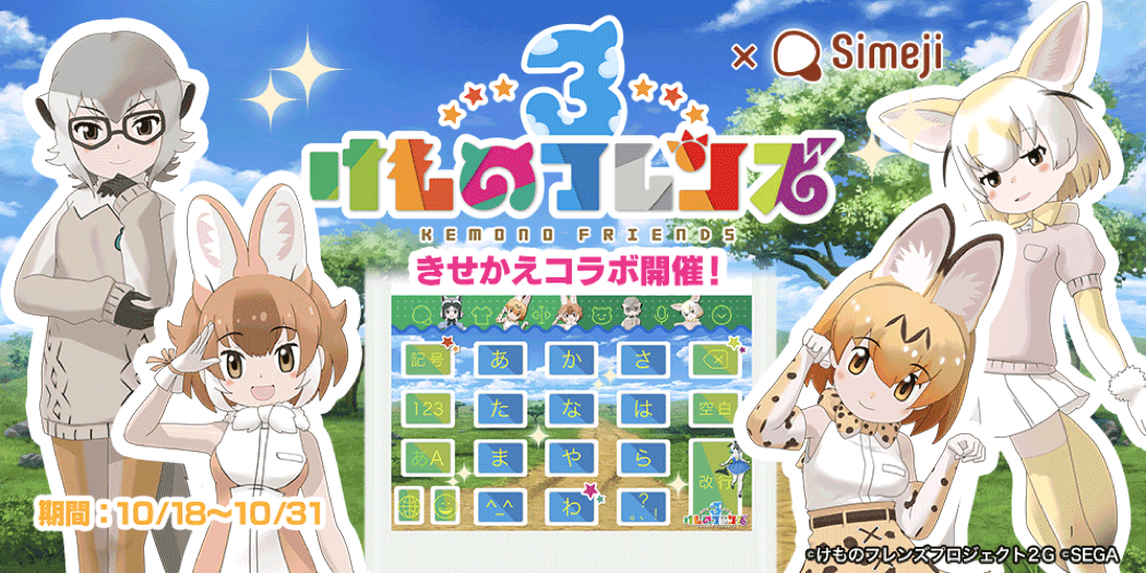 バイドゥ株式会社(本社:東京都港区、代表取締役社長 Charles Zhang)が提供する日本語入力&きせかえ顔文字キーボードアプリ「Simeji」(iOS、Android版)は、フレンズたちと”わくわくどきどき探検”するRPGゲーム「けものフレンズ3」と、期間限定のコラボキャンペーンを本日より10月31日(木)まで実施します。