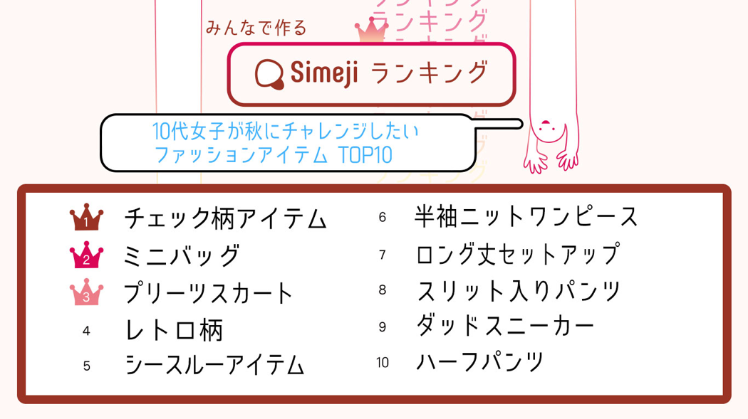 おしゃれ女子は、チェック済!? Simejiランキング10代女子2,000人が選ぶ 「秋にチャレンジしたいファッションアイテム TOP10」
