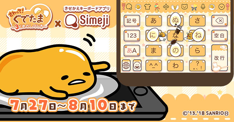 2018年7月27日(金)12:00から、「ぐでたま3」と、きせかえキーボードアプリ「Simeji」のコラボキャンペーンを開始します。