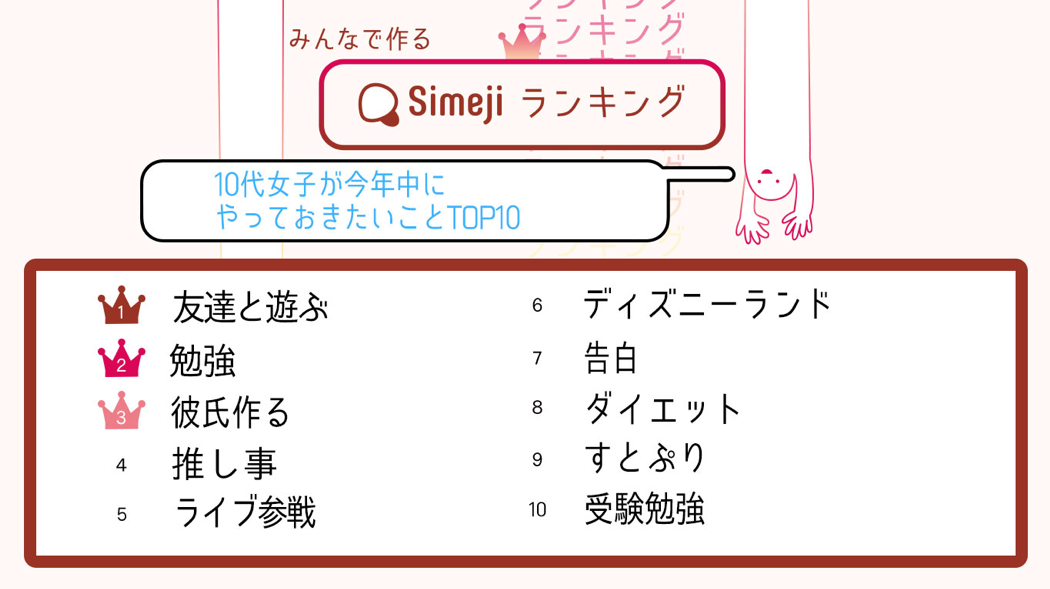 10代女子が今年やり残したことは“推し事(おしごと)”?? Simejiランキング10代女子2,000人が選ぶ 「今年中にやっておきたいこと TOP10」