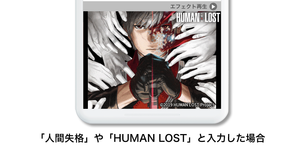 動画エフェクトとは、Simejiキーボード上で特定の文字を入力することで、キーボード上に特殊な演出が現れる入力エフェクト機能です。今回のコラボレーションでは「人間失格」や「HUMAN LOST」と入力すると、演出がお楽しみ頂けます。