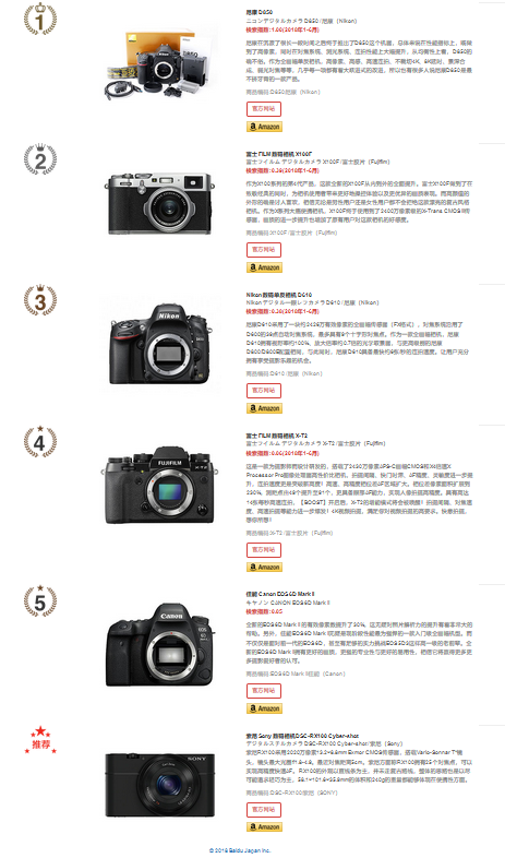 第一位是日本知名相机品牌尼康(Nikon)旗下最具人气产品D850,比起以往的产品加强了连拍性能,对于高像素、高感、高速连拍、不裁切4K、8K延时、景深合成、弱光对焦等功能方面,都有了巨大的提升。第二位是富士胶片(Fujifilm) X100F。第三位是尼康(Nikon)数码单反相机 D610。