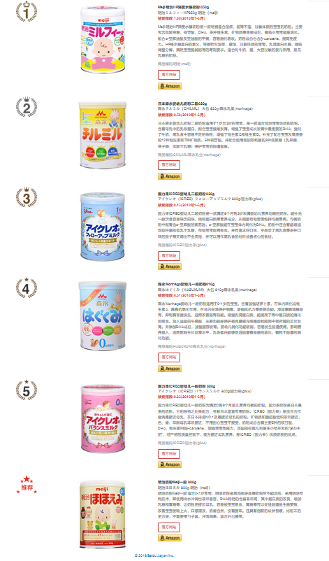 获得第一位的是明治「无敏配方」奶粉,本奶粉专为一些对食物过敏,如对牛奶蛋白过敏的宝宝研制,配製深度水解奶粉以乳清蛋白为基础,更接近母乳。第二位是森永婴幼儿奶粉二段,本款奶粉富含DHA,强化铁元素促进宝宝大脑发育和肠道健康。第三位的是固力果ICREO婴幼儿二段奶粉。
