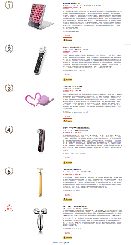 第一位是日本美容界人气响当当的Exideal LED美容仪EX-280 ,采用光动力原理, LED发出不同波长激活深层细胞, 让肌肤更好地进行新陈代谢。红光修复肌肤、延缓肌肤老化,蓝光抑制痘痘粉刺、修复皮肤表面的粗糙和黄光祛除色斑暗沉。第二位是雅萌HRF-1射频再生美容仪。第三位是avex beauty method。