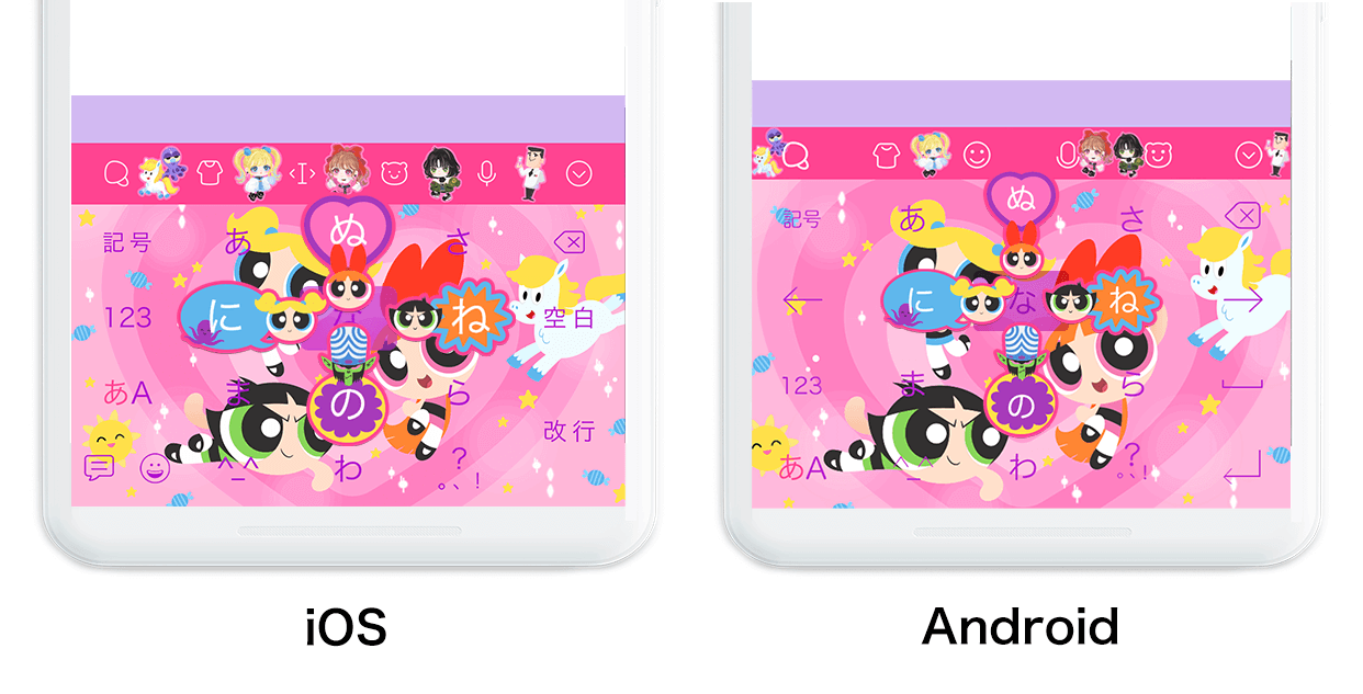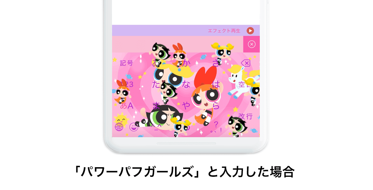 入力エフェクト機能とは、ユーザーが文字を入力し、変換候補より特定のキーワードを選択することで画像がキーボード上に現れる機能です。「パワーパフガールズ」や他の関連ワードを入力することで可愛いイラストがキーボード上に現れます。ワードを入力して、当コラボレーションならではのエフェクトを体験してください。