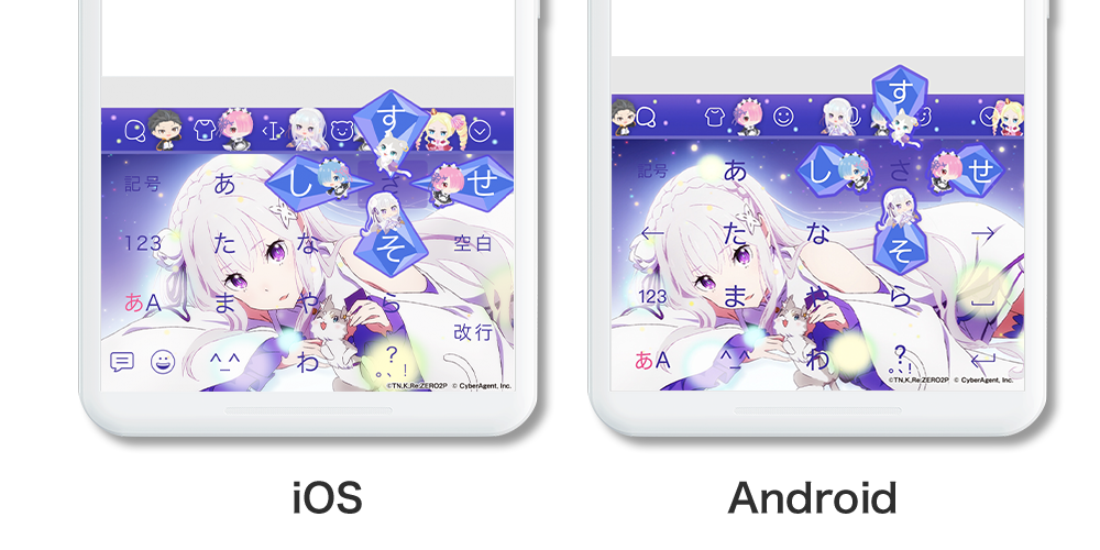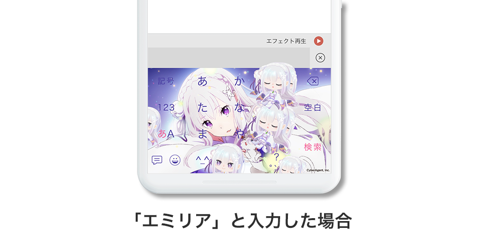 入力エフェクト機能とは、ユーザーが文字を入力し、変換候補より特定のキーワードを選択することで画像がキーボード上に現れる機能です。「エミリア」や他の関連ワードを入力することで「リゼロ」キャラクターのイラストがキーボード上に現れます。ワードを入力して、当コラボレーションならではのエフェクトを体験してください。