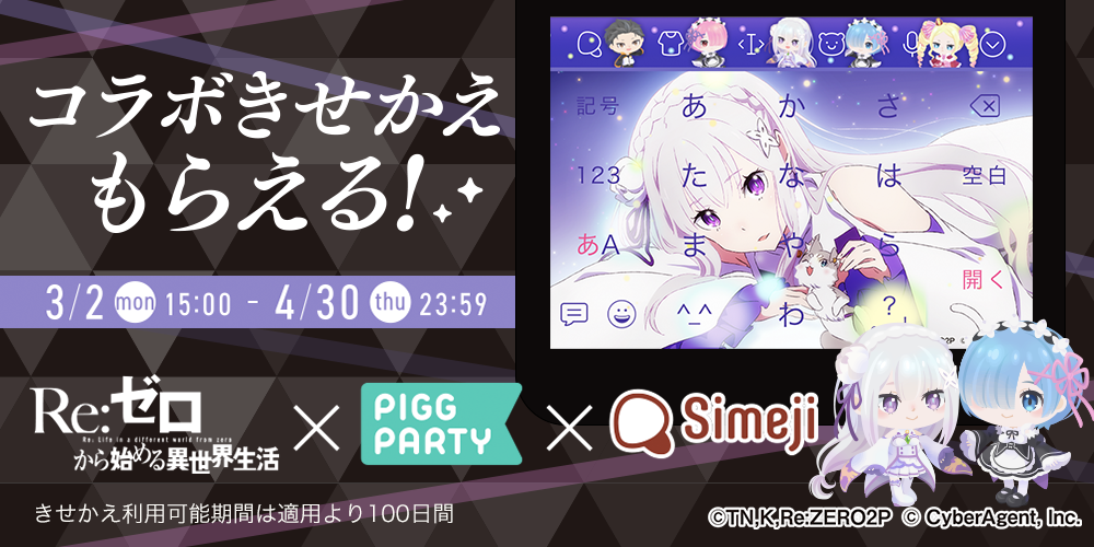 ダウンロードNo.1キーボードアプリ*「Simeji」、 アバターコミュニティアプリ『ピグパーティ』、アニメ『Re:ゼロから始める異世界生活』との期間限定コラボ決定!
