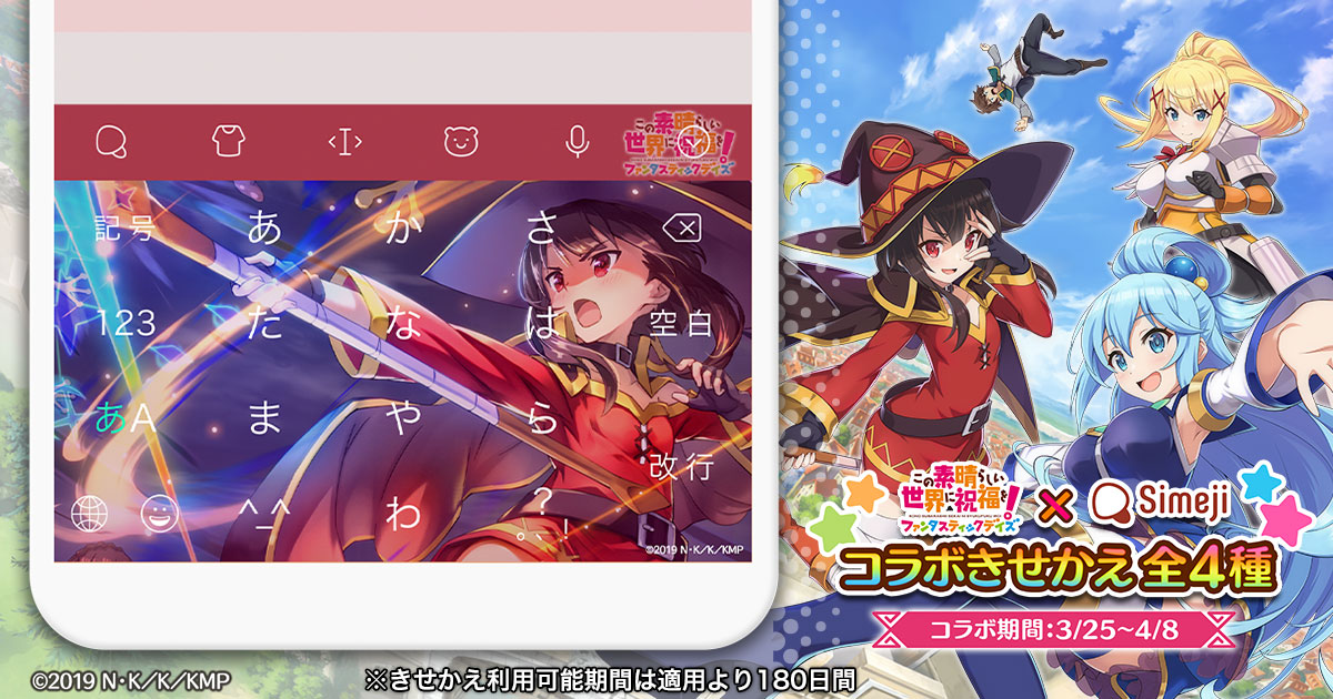バイドゥ株式会社(本社:東京都港区、代表取締役社長 Charles Zhang)が提供する日本語入力&きせかえ顔文字キーボードアプリ「Simeji」(iOS、Android版)は、「このすば」初のスマホゲーム『この素晴らしい世界に祝福を!ファンタスティックデイズ』(以下、『このファン』)との期間限定のコラボキャンペーンを本日より2020年4月8日(水)まで実施します。