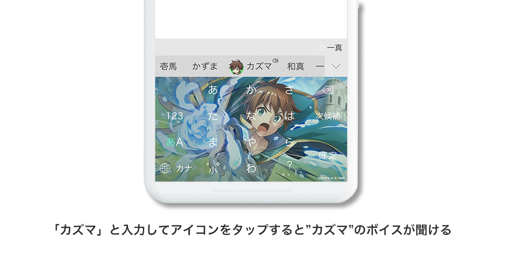 音声エフェクト機能とは、ユーザーが文字を入力し変換候補より特定のキーワードを選択することで、音声が流れる機能です。Simejiのキーボードで「カズマ」と入力することで「このすば」のキャラクターボイスが発動します。