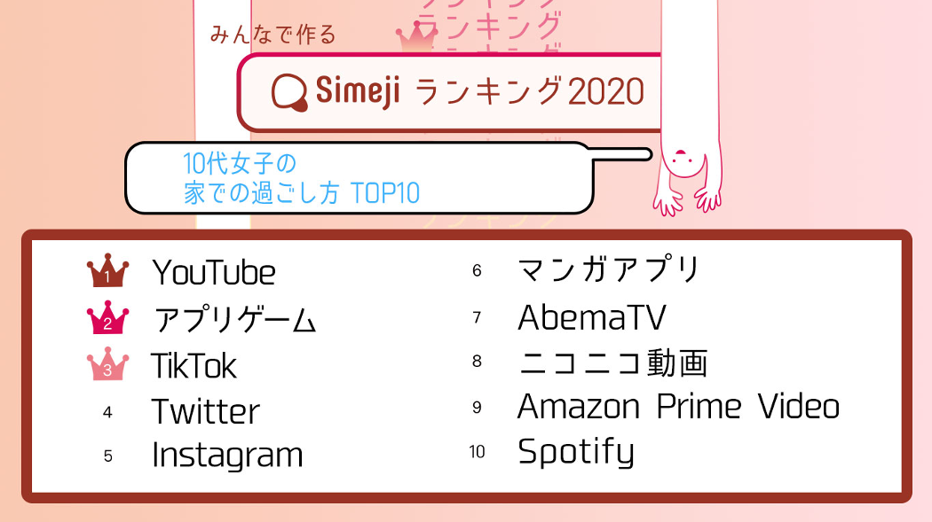 世界中で猛威をふるう新型コロナウィルス。臨時休校やリモートワークなど不要不急の外出を控える今、家の中でどのようにお過ごしでしょうか? Simejiランキングは、気になる10代女子の家での過ごし方についてアプリ、サービスに絞って調査しました。
