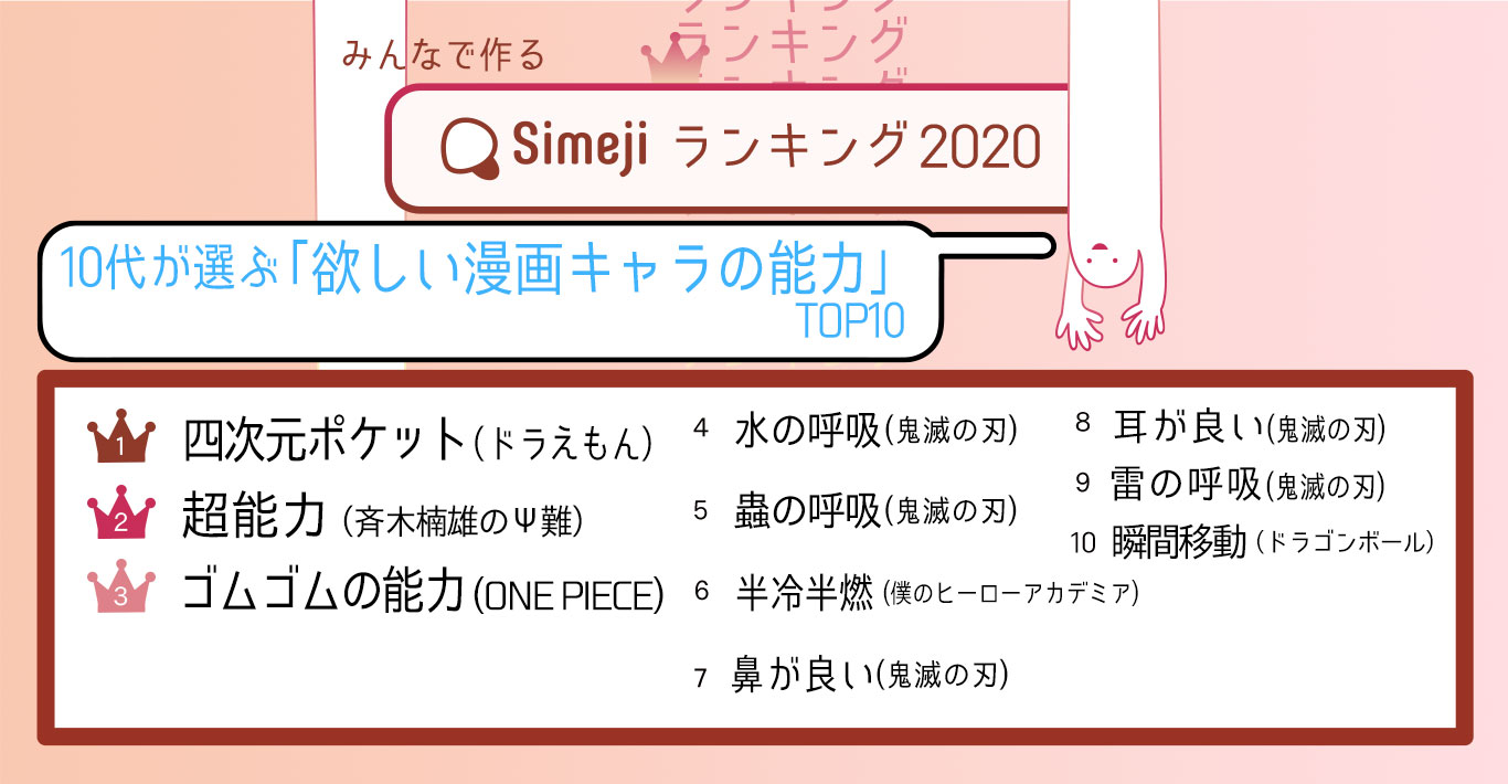 大好きな漫画作品には、かっこいい必殺技や便利な特殊能力がてんこ盛り!自分も使えたらなぁと妄想に浸ること、漫画好きの皆様ならあると思います。前回の「なりたい漫画キャラクター」(https://simeji.me/simeji-ranking/backnumber/2020_29/)に続いて、今回Simejiランキングは「欲しい漫画キャラの能力TOP10」を調査しました。