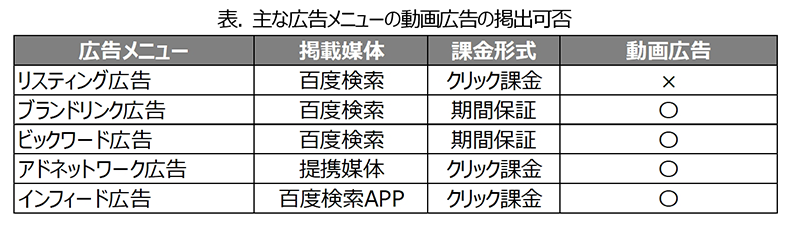 バイドゥでは、インバウンド、越境ECなど中国人を対象としたビジネスを展開する日本企業様に対して、百度リスティング広告、百度アドネットワーク広告、百度インフィード広告、百度グループのCtrip(携程)、iQiyi(愛奇芸)などのウェブ広告サービスを提供しております。下記、表は既存の広告メニューにおける動画広告の掲出が可否です。
