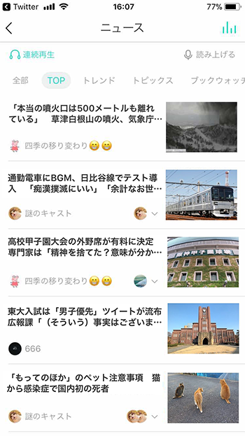 さらにひとつのニュースにつき、様々な声の特性を持つキャストが読み上げを行うため、自分の好みの声でニュースを楽しむことも可能です。男性ボイス、女性ボイス、かわいいボイスやダンディーなボイス…など、声の魅力とニュース内容の組み合わせて楽しみ方が広がります。