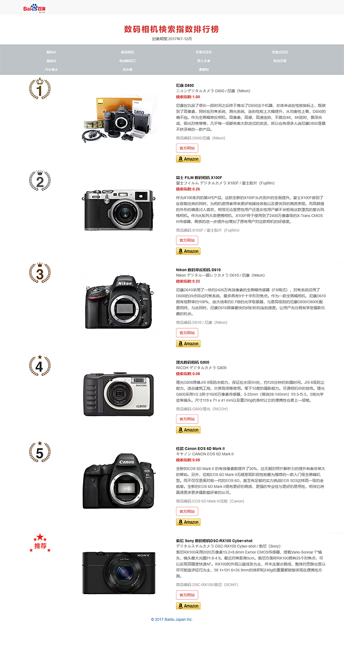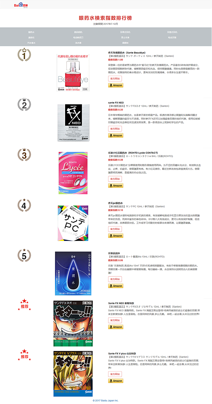 对于赴日旅游的中国游客来说,购物是他们的主要活动之一。2017年中国游客的人均消费额达23万382日元(约合人民币1万3,316元*),同比总体海外游客的人均消费额为15万3,921日元(约合人民币8,897元),高出 7万6,461日币(约合人民币4,419元)。其中仅购物一项,中国游客的平均消费额为11万9,319日元(约合人民币6,897元),是总体游客平均消费额的2倍以上。(5万7,154日元(约合人民币3,304元)。大部分中国游客喜欢在出行前预先拟定详细的购物清单,网上搜索是获取信息的重要手段。为此,百度日本专门设立了能够分类搜索日本商品关注度的网站,从2015年起,每年都发表了百度日本旅游购物排行榜。今年根据游客的需求,发表了2017年度下半年(7月-12月份)的百度日本购物排行榜,内容主要来源于百度搜索数量。*汇率以2018年1月19日中国银行折算价1日元=0.0578元计算