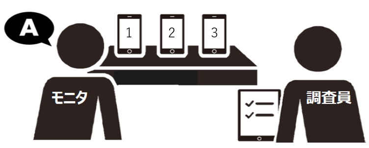 ・横一列に並べた端末に予め用意したテキストをモニタが読み上げ