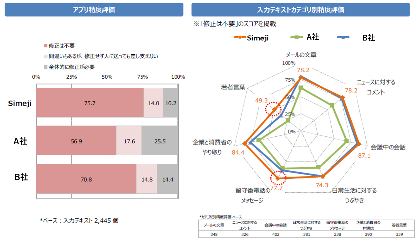 今回の調査では、調査対象であるスマホ向け日本語入力3サービス(Simejiを含む)の中でSimejiがほか2サービスよりも入力精度が高いという結果が出ました。また、2サービスと比較して「若者言葉」「留守番電話のメッセージ」の入力精度が高いという傾向が伺えました。