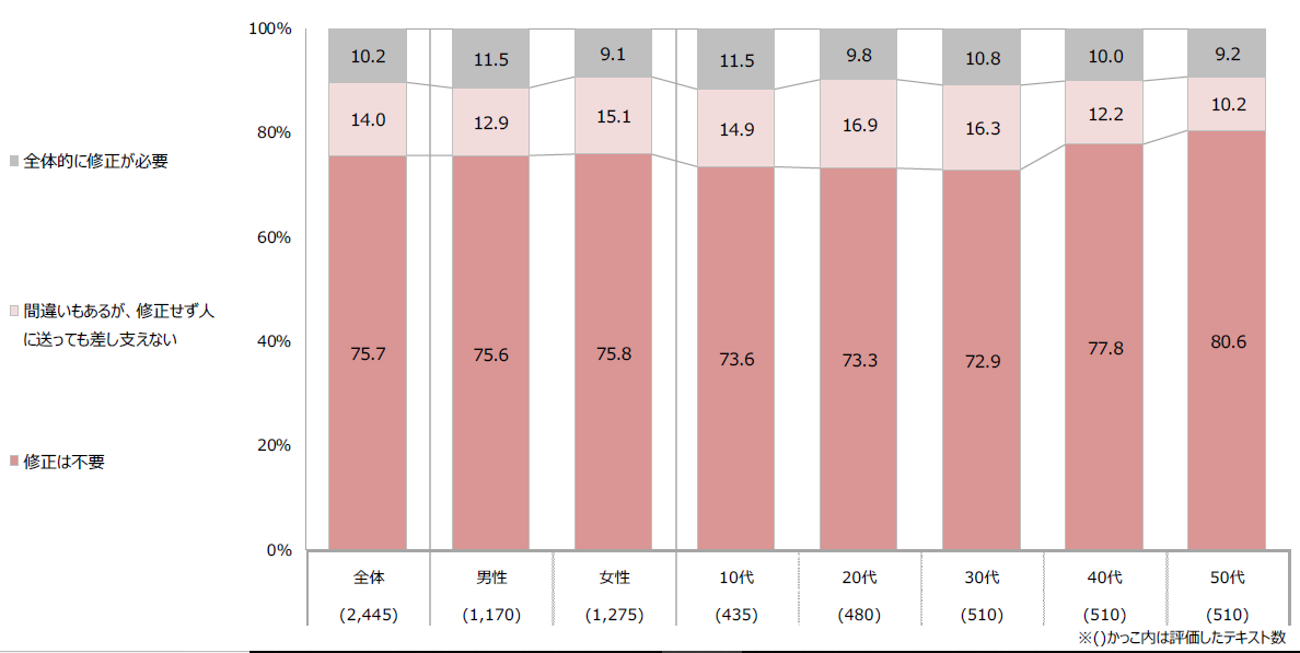 ・A社は57%「修正不要」、18%は「修正せずに人に送れる」と評価されたが、26%は修正が必要だった。また、男女・年代別に見ても2~3割が「修正が必要」と評価された。