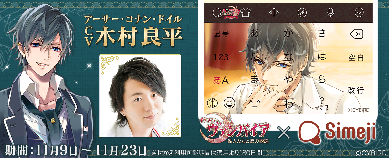 バイドゥ株式会社(本社:東京都港区、代表取締役社長 Charles Zhang)が提供する日本語入力&きせかえ顔文字キーボードアプリ「Simeji」(iOS、Android版)は、本日より、大人気恋愛ゲーム「イケメンヴァンパイア◆偉人たちと恋の誘惑」の登場キャラクター「アーサー・コナン・ドイル(CV:木村良平)」のボイス付きオリジナルきせかえデザインを提供開始します。
