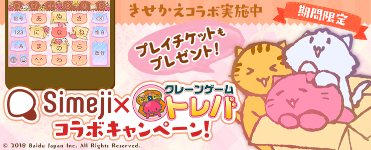 バイドゥ株式会社(本社:東京都港区、代表取締役社長 Charles Zhang)が提供する日本語入力&きせかえ顔文字キーボードアプリ「Simeji」(iOS、Android版)は、本日より、サイバーステップ株式会社(本社:東京都杉並区、代表取締役社長:佐藤 類)が提供するクレーンゲームアプリ「トレバ」とコラボし、オリジナルきせかえデザイン&プレイチケット(1枚)を提供開始します。