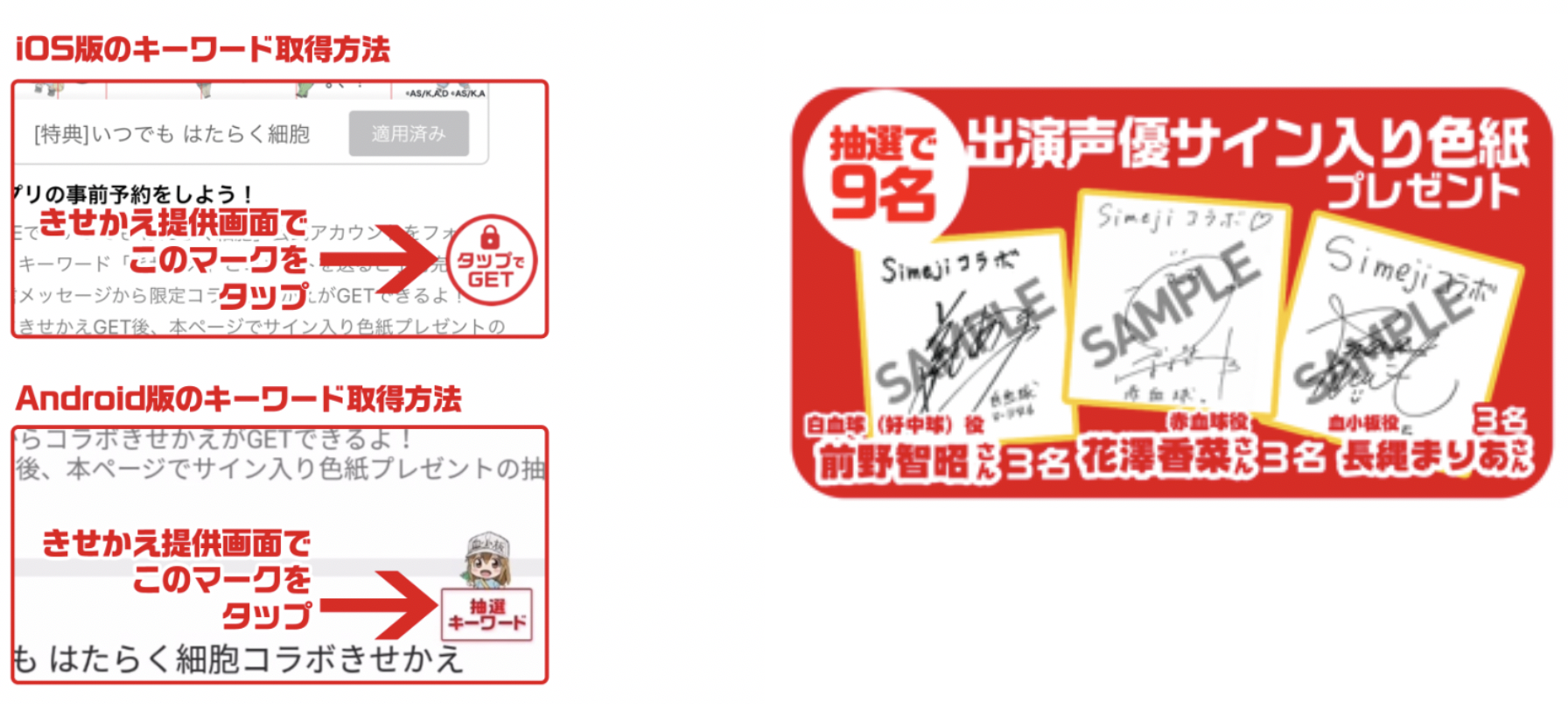 また、上記のきせかえデザイン取得後、コラボきせかえを適用することで画面に表示されるマークをタップすると抽選キーワードをゲットできます。そのキーワードを「いつでも はたらく細胞」のLINE公式アカウントに送信すると抽選で9名様にアニメの出演声優サイン入り色紙がもらえるキャンペーンにエントリーができます。