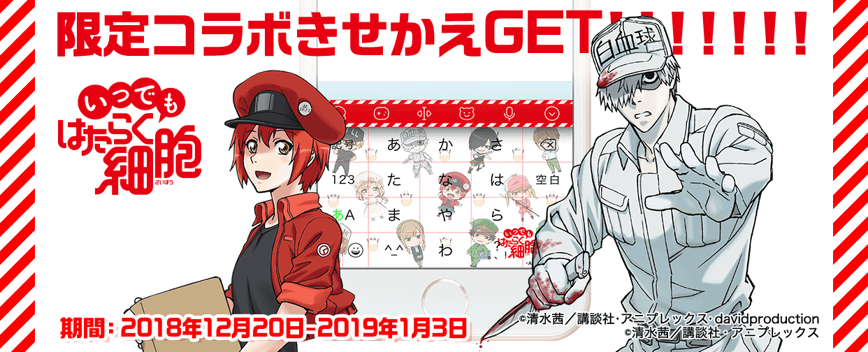 バイドゥ株式会社(本社:東京都港区、代表取締役社長 Charles Zhang)が提供する日本語入力&きせかえ顔文字キーボードアプリ「Simeji」は、テレビアニメ「はたらく細胞」初のゲームアプリ「いつでも はたらく細胞」と本日12月20日から2019年1月3日の間、期間限定でコラボレーションを実施します。Simejiをダウンロードし、いくつかのミッション(条件)をクリアするごとにSimejiと「はたらく細胞」のオリジナル限定コラボアイテムが取得、またプレゼントキャンペーンに応募可能です。
