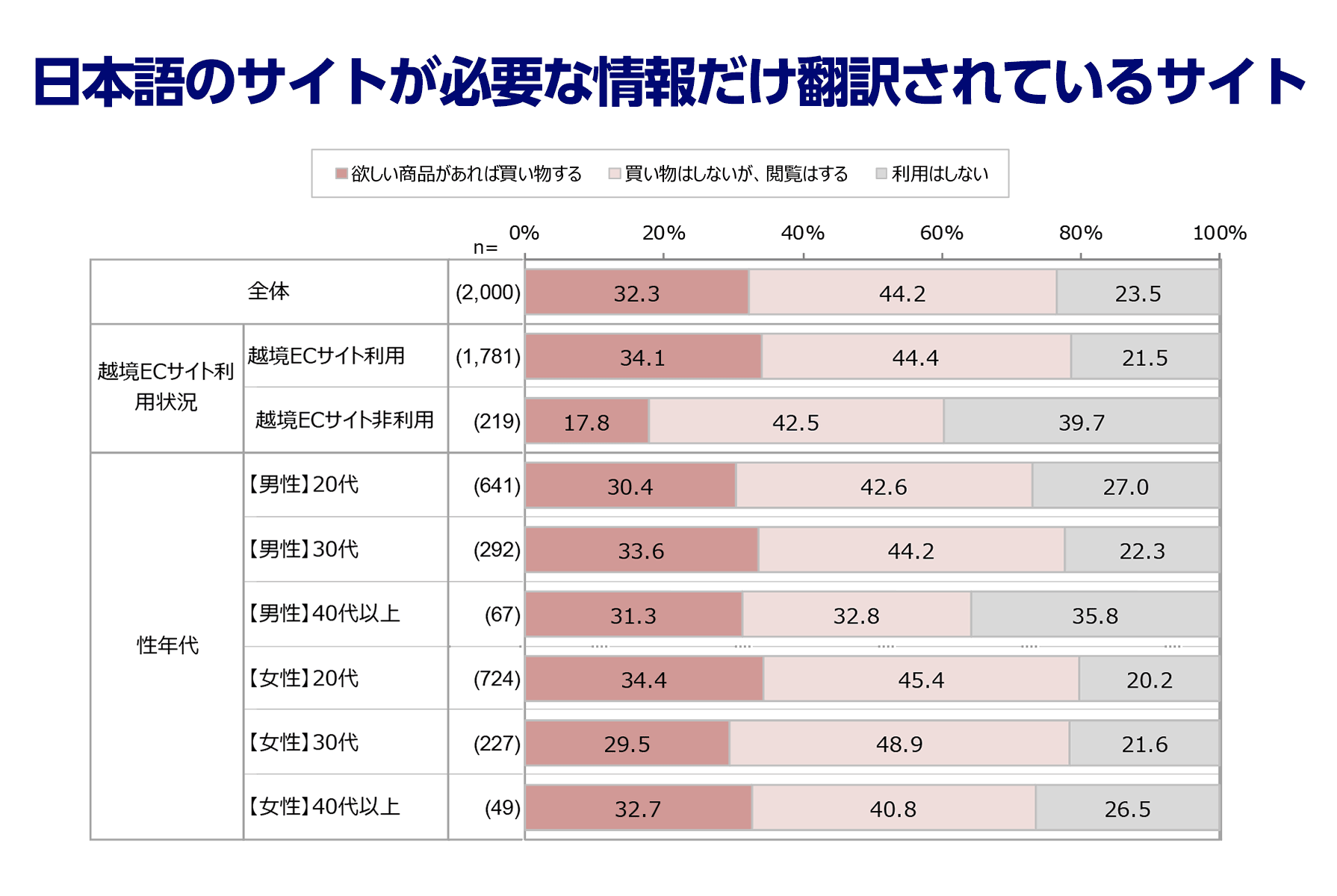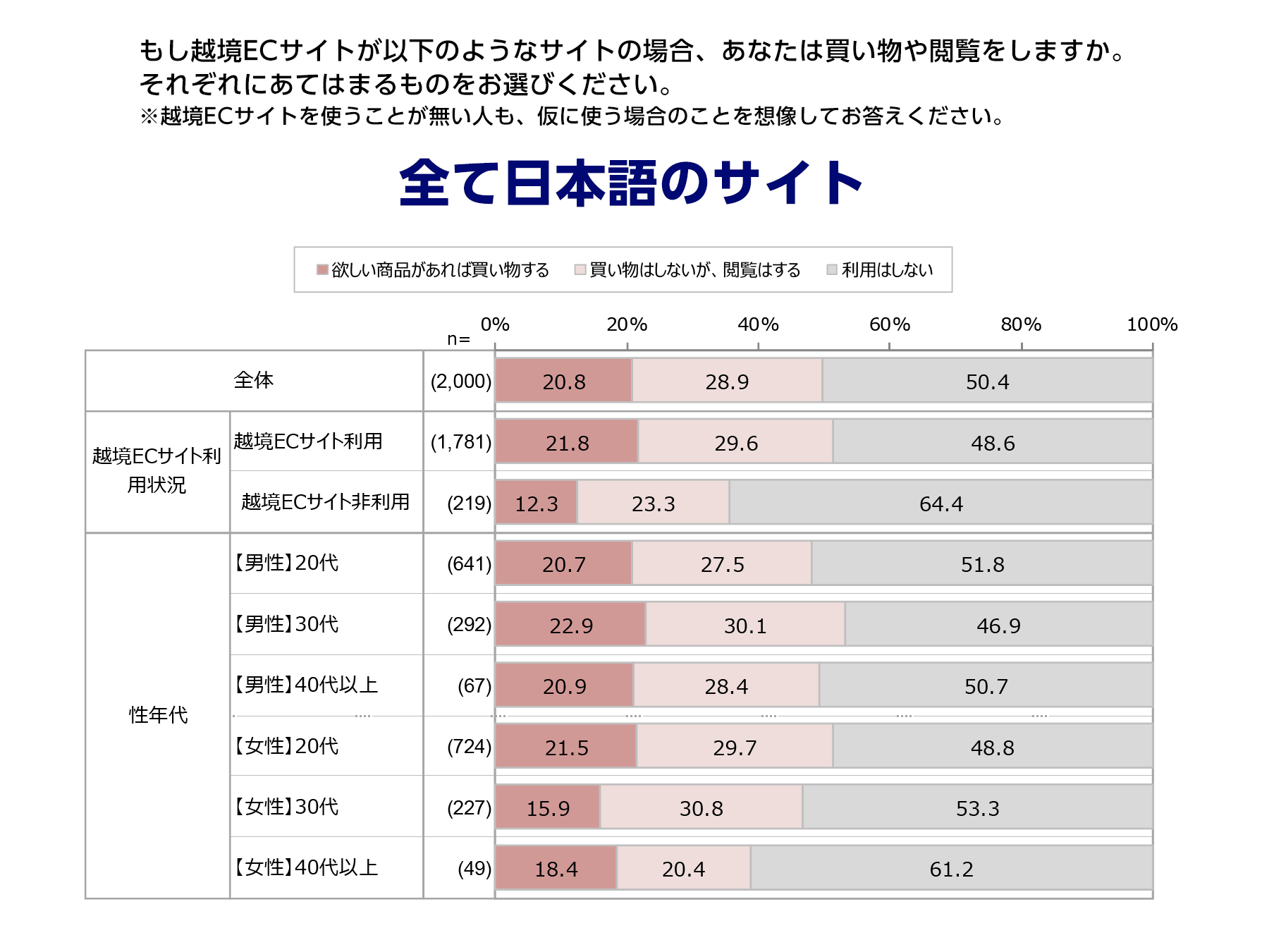 ・「全て日本語のサイト」で「買い物する」を選んだのは越境ECサイト利用者で2割程度。