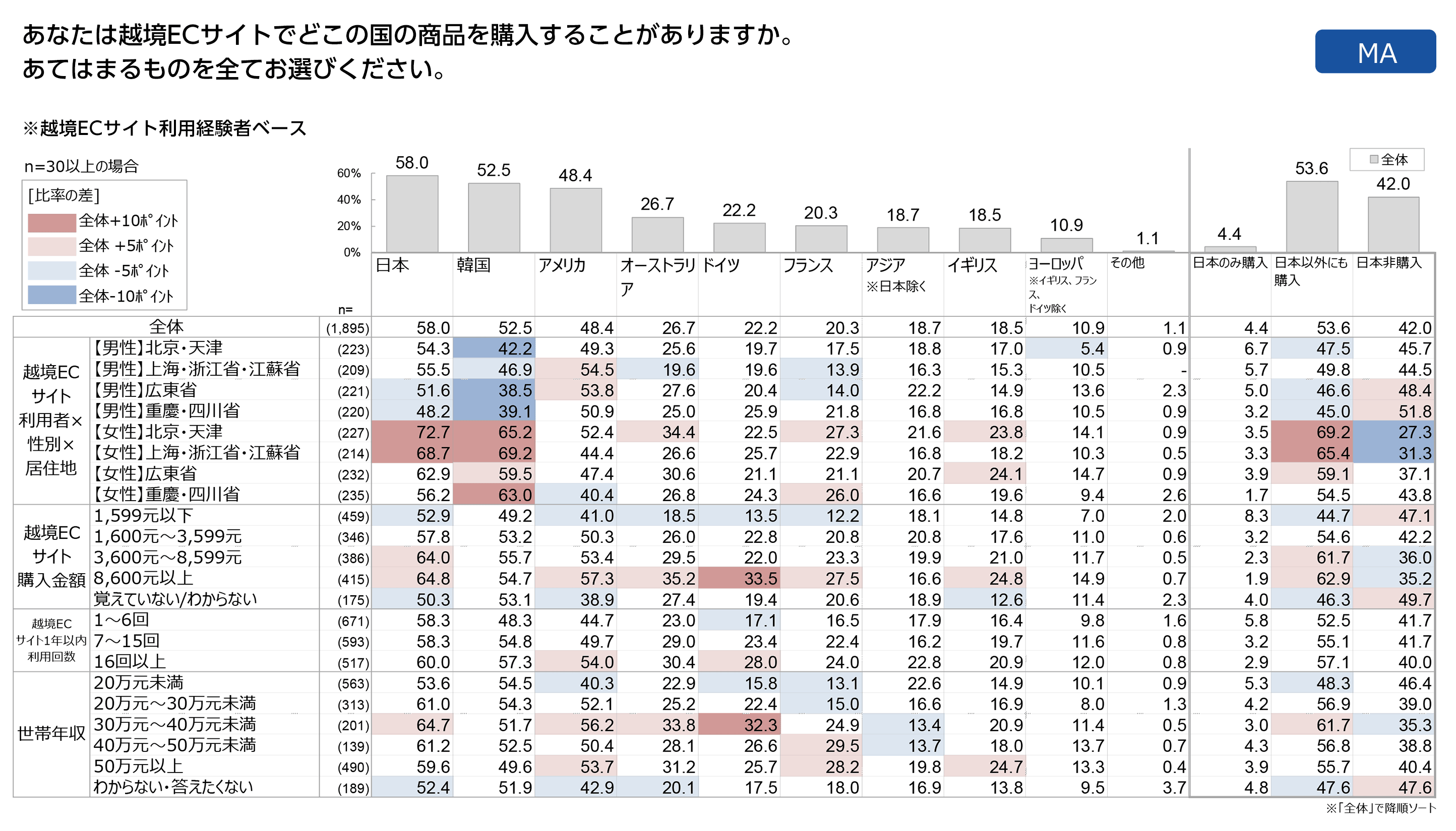 越境ECサイトで購入する商品は、日本が最も多く、特に女性、越境ECサイト高額購入者で多い。