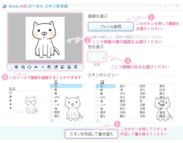 バイドゥ株式会社(本社:東京都港区、代表取締役社長Alan Zhang、以下バイドゥ)は本日、パソコン用日本語入力システムBaidu IMEの新バージョン3.5をリリースしました。新バージョンでは、好きな画像をスキン(変換候補の表示画面)として使用できる「マイスキン機能」を新規搭載しています。また、「ツイート」ボタンもついており、作成したスキンはツイッター上で簡単にシェアできます。現在、Baidu IMEでは100種類以上のスキンを提供しており、今回のマイスキン機能により、スキンデザインのバリエーションがより一層豊富になります。